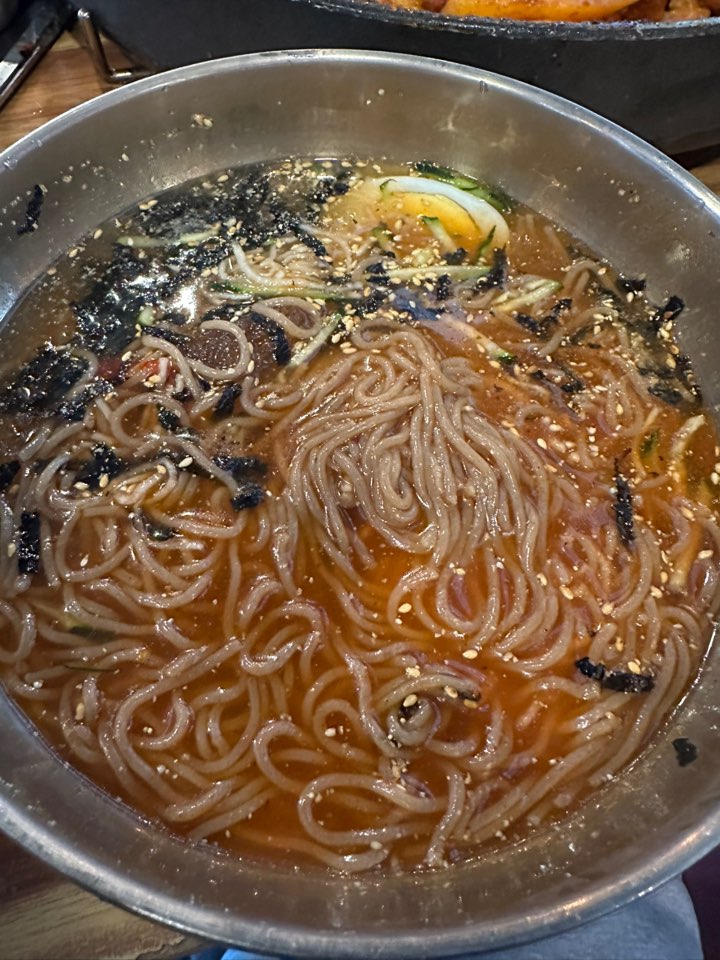 막국수도 주문해 보았다. 양이 꽤나 많다. 사진은 먹다가 중간에 촬영하였다. 맛도 시원하고 새콤해서 닭갈비와 어울린다. 초반에 주문하여 닭갈비와 함께 먹으면 조합이 좋다. 아 참고로 면은 자가제면이라고 한다.